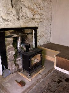 I was part of a work party that installed a wood-burning stove in the bothie, in addition to carrying out other maintenance tasks such as painting and sweeping the chimneys. We had to carry down all of the necessary tools and materials, including a generator, nine bags of sand, three bags of cement, and scaffolding. However, we were equipped with a wooden stretcher for the heavier items, so a four-man team was able to carry the 200kg cast-iron stove and two 3×2 foot paving slabs.
