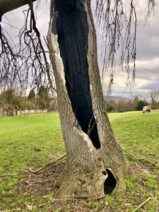 So, this noble specimen might have been strategically placed to enhance the view from Ayton Hall. It looks pretty lively, but surprise, surprise, its trunk is hollow, scorched by a score of fires. What’s the outlook for its future, you ask? Well, it’s under siege from the air by ‘Chalara fraxinea,’ the Ash dieback disease, and from within by the flames. Not good, I’d say.