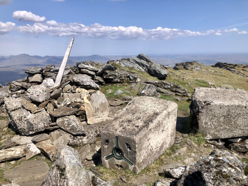 This proved to be a temporary camp, erected by the Ordnance Survey during their meticulous triangulation of the land. Such encampments, dubbed Colby Camps after Major General Thomas Colby, the Survey’s Director from 1820 to 1846, are not uncommon in the upland landscape. Though the trig pillar atop the summit would not have been built by those early surveyors, it now reclines in ignominy, broken yet serving admirably as a seat1http://canmore.org.uk/site/74135.
