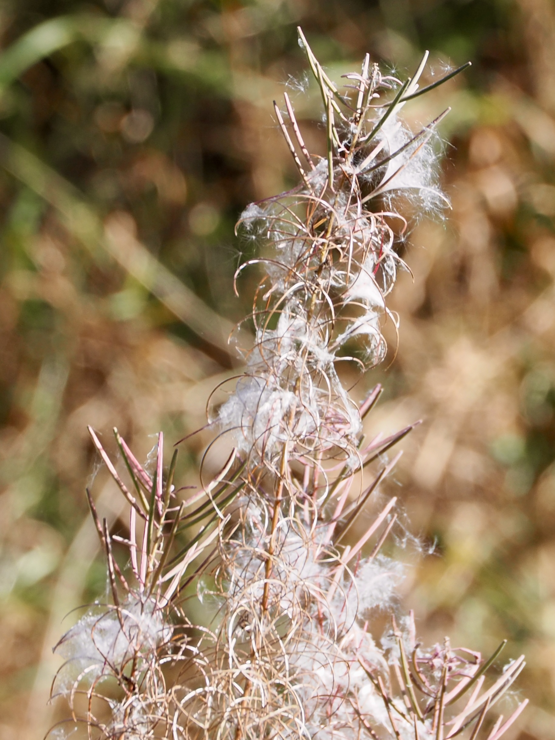 A close-up of a tall, spindly plant with numerous white, fluffy seed heads that resemble cotton. The plant has reddish-brown stems and leaves. The background is blurred and appears to be a field of grasses.