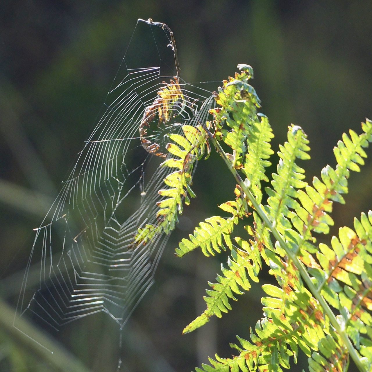 A close-up of bracken with a large spider web attached to one of its fronds. The web is illuminated by sunlight, highlighting its intricate pattern. The fern's fronds are green with some brown edges.