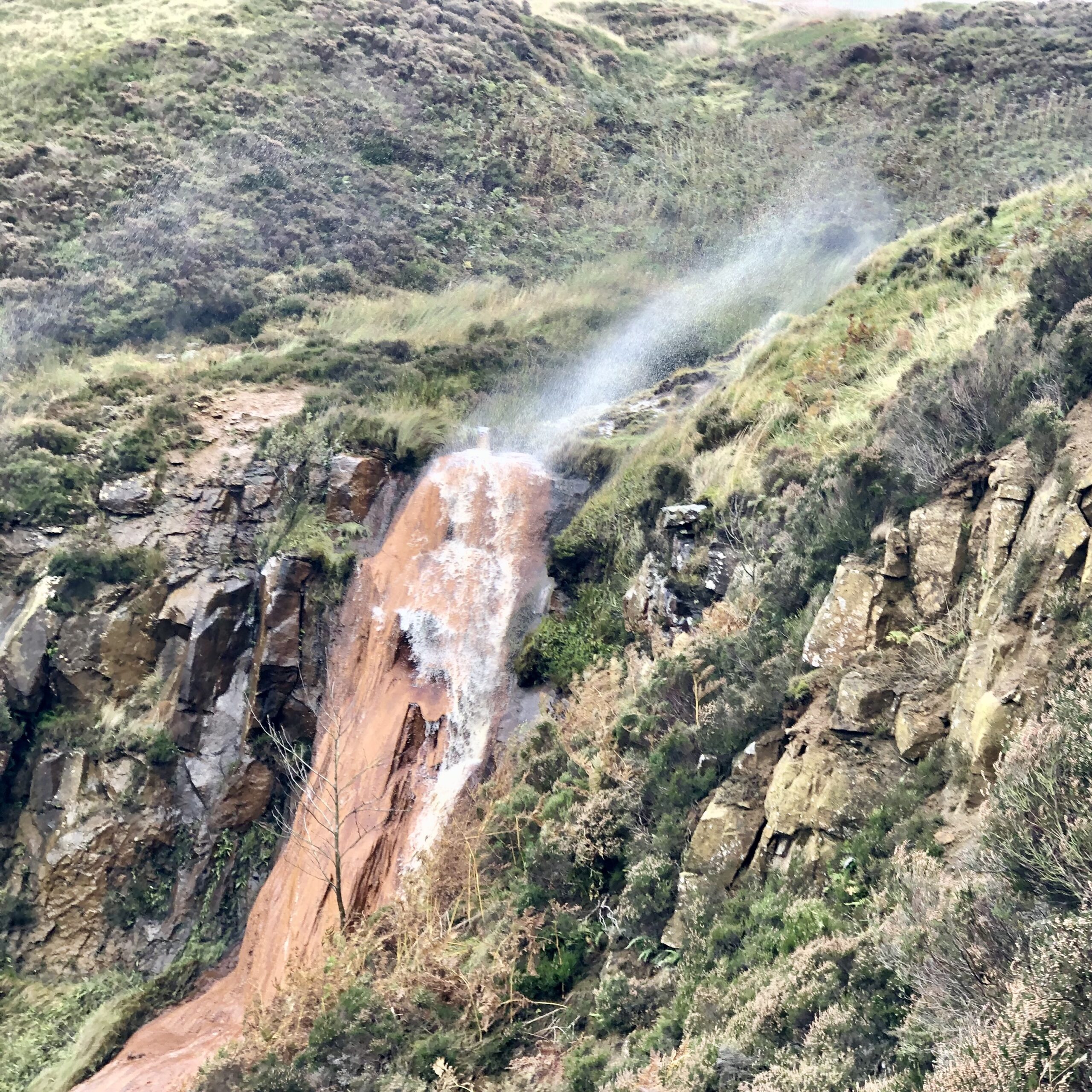 A photo of a cascading waterfall, flowing down a rocky cliff face with a reddish-brown hue. The water is blown back creating a spray at the top, and the surrounding landscape is green with vegetation.