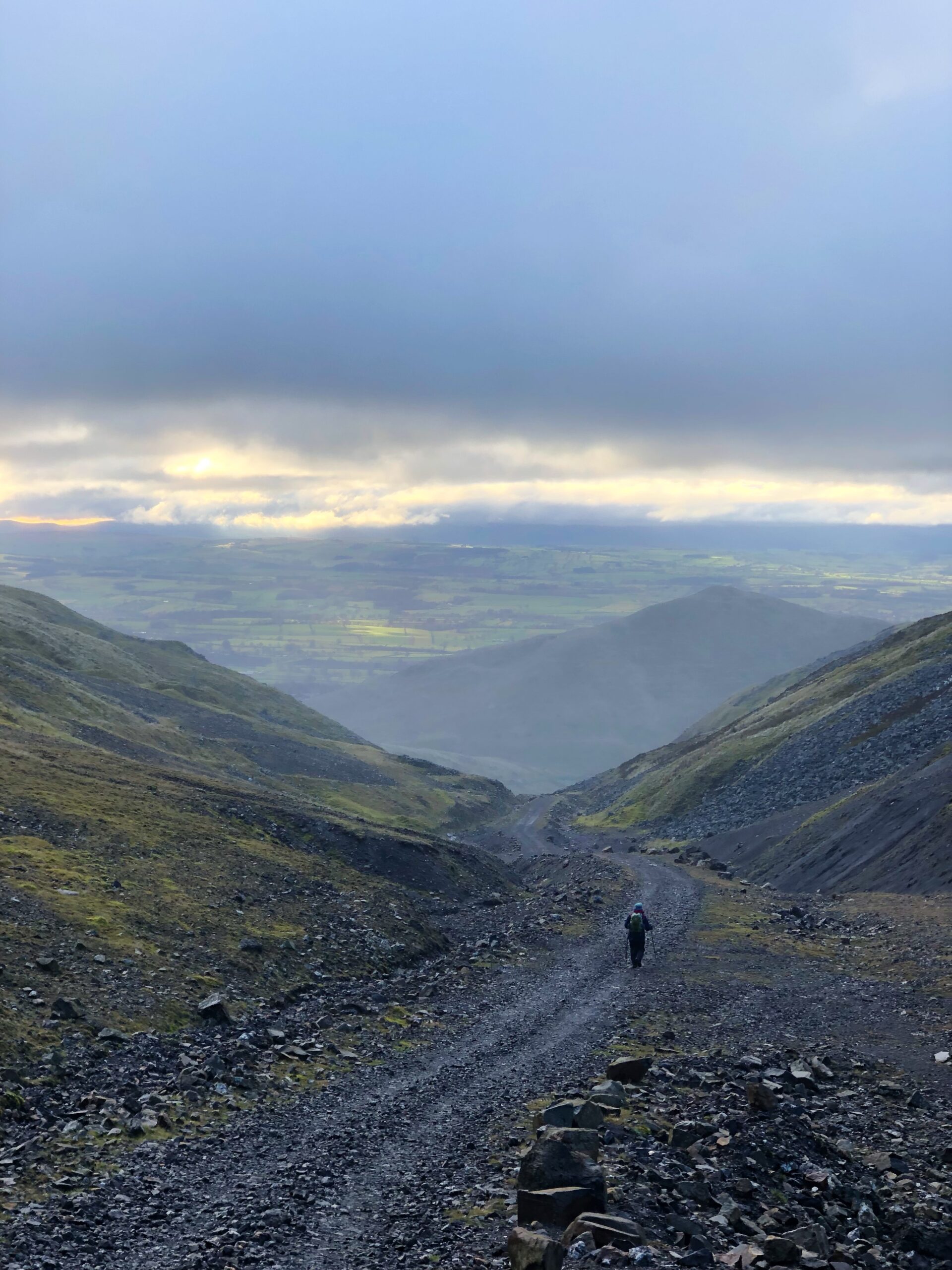 A lone hiker walks down a winding path through a rocky landscape. The path descends towards a valley, where a distant village can be seen nestled along with the silhouette of a sugar-loaf hill. The sky is overcast with a hint of sunlight breaking through the clouds. The overall scene conveys a sense of solitude and adventure.