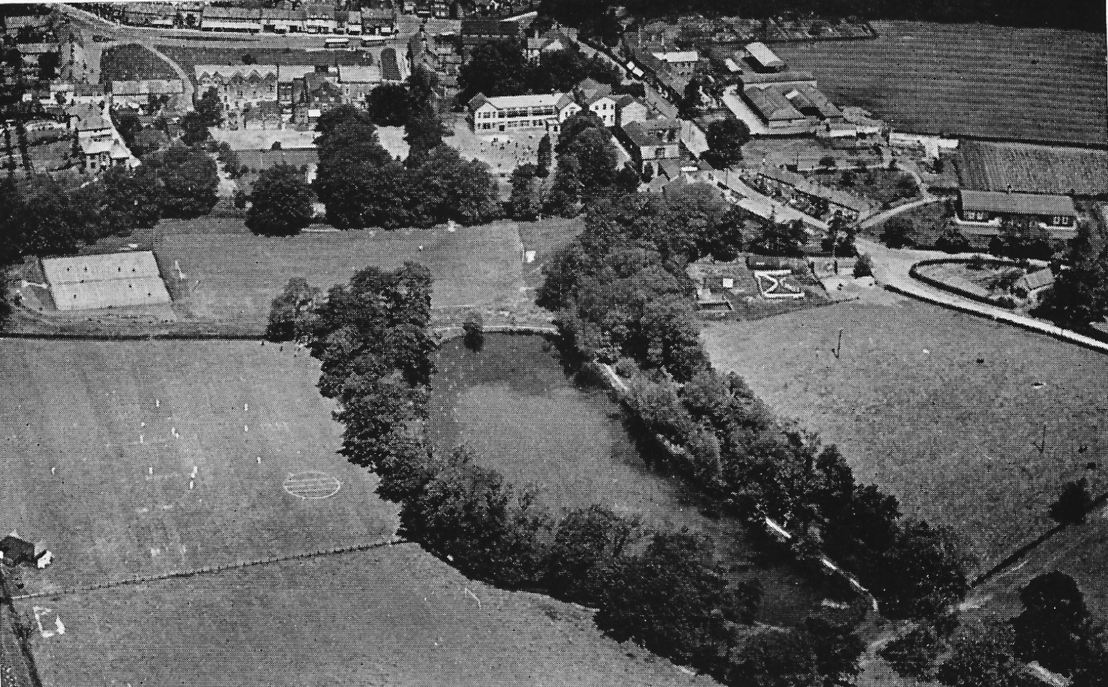 An aerial black and white photograph of a school campus taken about 1940. The image shows a large central field with a pond surrounded by trees. Buildings with schoolhouses and playing fields can be seen surrounding the central area.