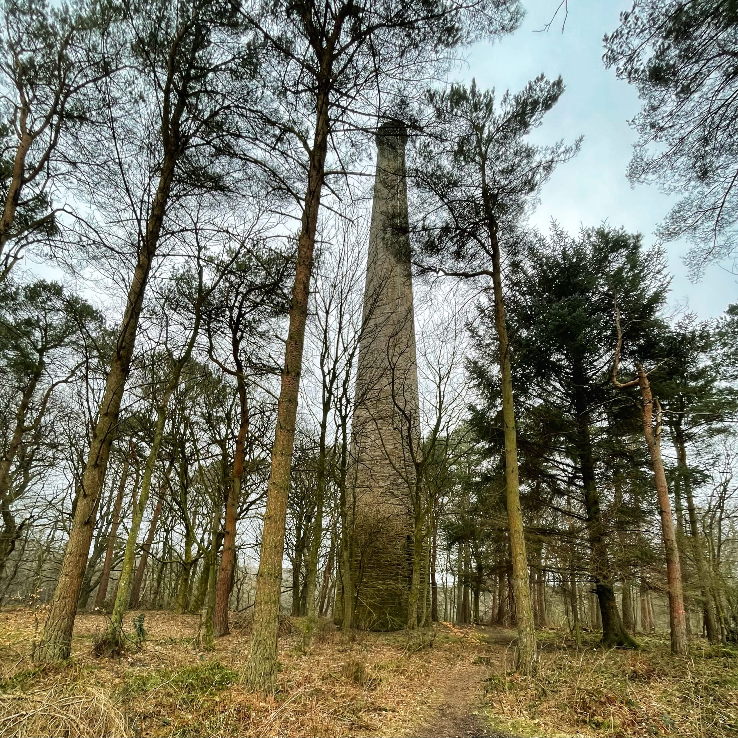 A tall, weathered stone chimney stands prominently in the centre of the frame, surrounded by tall, bare trees. The ground is covered in brown leaves and pine needles. The sky is overcast.
